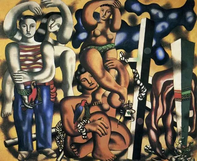 再来看莱热画中人物的背景,以及她们在做什么,画家显然将这种变化与一个工业化与集体化的世界联系在一起了。我看这些画,每每想起赫胥黎所著《美丽的新世界》,莱热所画的正是小说中那些由“中央孵化与条件设置中心”根据社会需要制造出来,因吃“唆麻”而快乐的女人。莱热在上世纪二十年代的画,包括《三个女人》及《拿着一本书的女人》(1923)、《红色背景下的两个裸女》(1923)、《三个人物》(1924)、《手持花瓶的女人》(1927)等,女人单独或结伴在一起,没有背景或背景无关紧要,仿佛是“中心”刚刚制造出来的一批人;三十到四十年代,如《两只鹦鹉的组合》(1935-1939)、《杂耍艺人和他的搭档》(1948)、《野营者》(1954)和《乡村远足》(1954)等,女人出现在生活情景或工作场所中,仿佛已经被“中心”派送到世界各地去了。