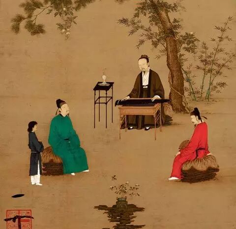 宋徽宗《听琴图》,相传图中弹琴者为宋徽宗自画像。