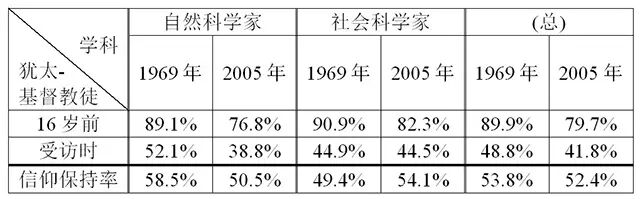 将RAAS样本与卡内基委员会调查样本对比同样显示,家庭宗教背景的影响一直是导致科学家宗教信仰的最主要因素。1969年任职于美国顶级高校的科学家中,有89.9%在16岁前是犹太-基督教徒,受访时这一比例降到48.8%,信仰保持率为53.8%;2005年任职于美国顶级高校的科学家中,有79.7%在16岁前是犹太-基督教徒,受访时这一比例降到41.8%,信仰保持率为52.4%,同1969年相差无几(见下表,据Ecklund et al. 2008: 1814-1815计算)。