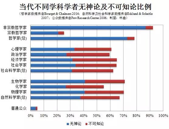 不过,自然科学家和社会科学家之间的宗教信仰差异不显著,并不意味着科学之外的其它学科同样如此。事实上,在当代西方学术界,宗教信仰比例最低的群体既不是自然科学家,也不是社会科学家;去宗教化最为决绝者,非哲学家莫属。