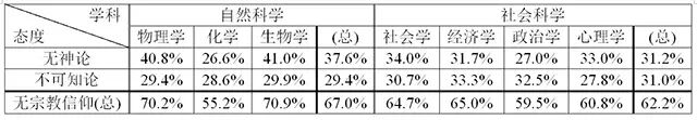 尽管在卡内基委员会的调查样本中,即便“宗教人”比例最高的群体(数学家与统计学家),较之普通公众的相应比例仍旧望尘莫及,但这份调查体现的学科差异,却为宗教人士提供了一种极其符合科学主义话语模式的说辞。毕竟在一般人看来,数学与自然科学的“科学性”远远高于社会科学,而经济学、政治学、社会学的“科学性”又远远高于心理学和人类学。因此人们很自然地从这份调查中得出结论:越是“科学性”高的学科,“宗教人”的比例就越高——接下来的推论,也就不言自明了。
