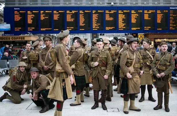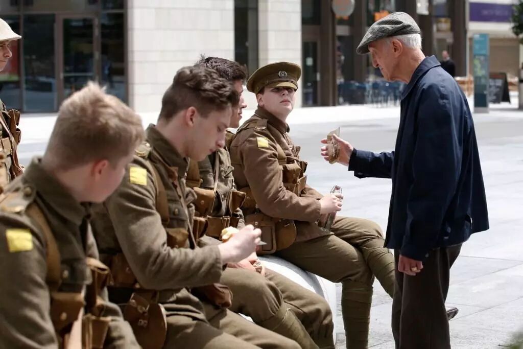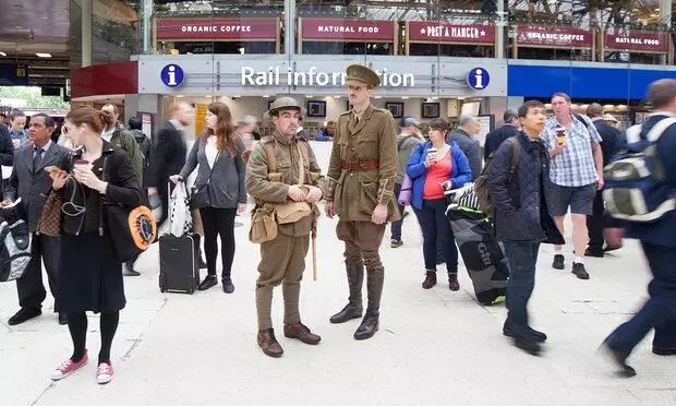 几周前的七月一日,在伦敦滑铁卢火车站,意外的情景让过往的人群止住了脚步。在车站中央,站着一群年轻的士兵,身上穿的却是一百年前的暗绿色军服。士兵们站在那里,几乎一动不动。他们沉默地,凝望着周围的一切。人们纷纷掏出手机,拍下眼前的情景。有位女士试图跟一名士兵交谈,但他并不答话,只是递给她一张卡片。卡片上写着士兵的名字、所在军团、年龄以及这样的一句话:“1916年七月一日,阵亡于索姆。”这样的情景真是诡异而令人不安。