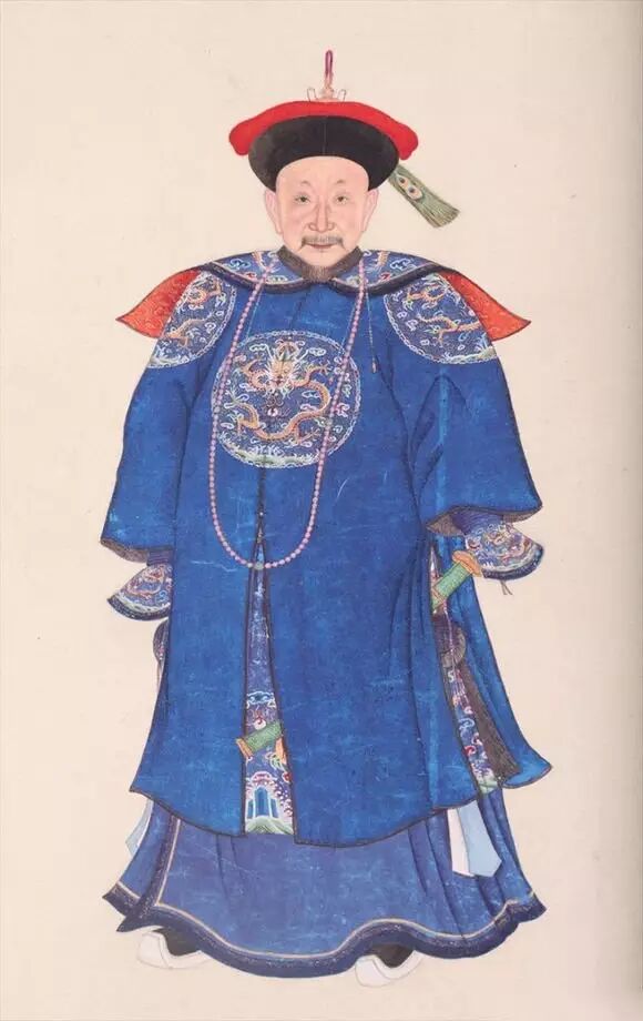 清《阿桂像》:此图中阿桂穿朝服,有披领;戴红宝石顶朝服冠,为暖帽