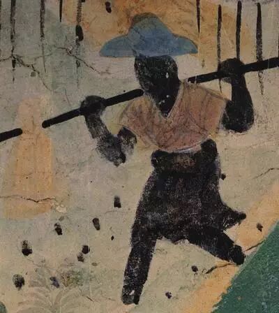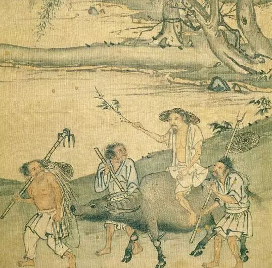 而这明代的《太平乐事图册》就更干脆。牛背上那位好歹还短衣短袴,前面的热得直接光了膀子,衣服也不穿了。这几位农夫都是蓬头跣足,算是反映了古代中国农民比较真实的精神面貌。
