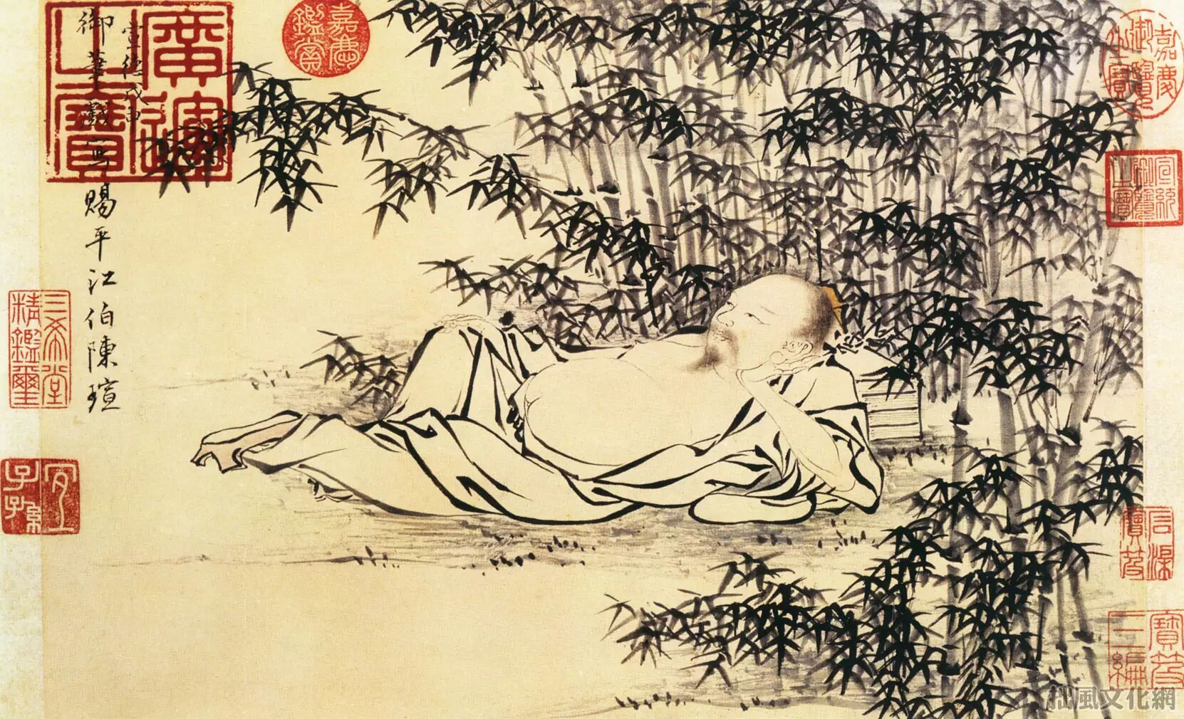 相比之下,我们的“长衣帮”自然就要辛苦些,毕竟除了何晏那样的魏晋狂士,敢于轻裘缓带的读书人还是不多见。这就好比领导人无论什么时候出现在公共场合,你都不会看见他穿背心裤衩一样。所以长衣帮只好应酬完了回到家里,才能把衣服敞开没事偷着乐。反映此类题材的画还不少,如王齐翰《槐荫消夏图》、刘贯道《消夏图》、朱瞻基《武侯高卧图》等。