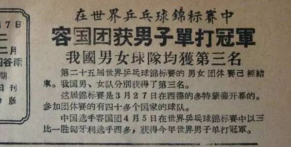 最近世界乒乓球赛在西德举行,中国大陆的男子选手全军尽墨!三十年前,在同一地方,我的好友容国团在世界男子单打的决赛中,左推右扫,把匈牙利名将西多杀得片甲不留。中国作为乒乓王国是从那天起的,到今天为止,整整三十年。没有哪一项体育活动能这样持久地一面倒的。