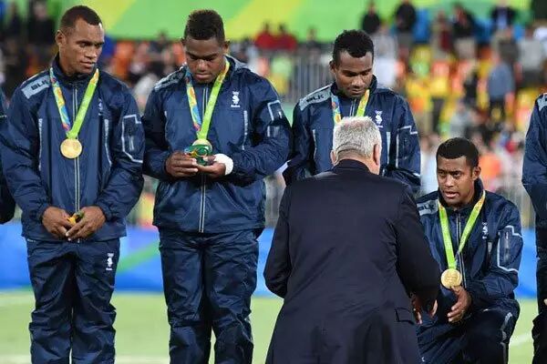 ▲ 里约奥运,斐济运动员跪下接受该国历史上第一枚金牌