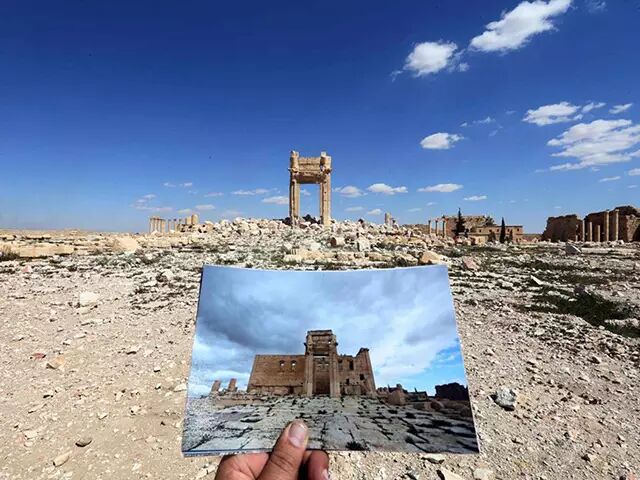 图十:被摧毁的帕尔米拉。图中人手持的照片,显示了寺庙被炸毁前的样子。