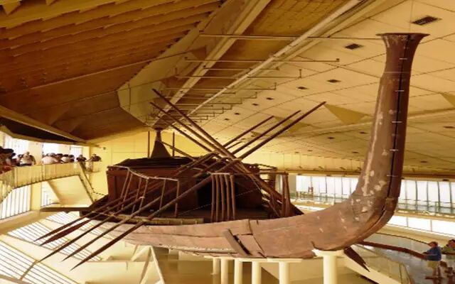 胡夫的尸体做好防腐处理后,很可能就是由这艘纤长的船运到吉萨;当然,还有一种可能是,这艘船是特别建造出来,作用是将法老带到往生之界。在靠近船尾地方,有个甲板室,一副轻巧的架子支撑起天篷,为法老遮蔽猛烈的阳光;船首高昂,类似一度充斥尼罗河的草船(papyrus boats)的形状。