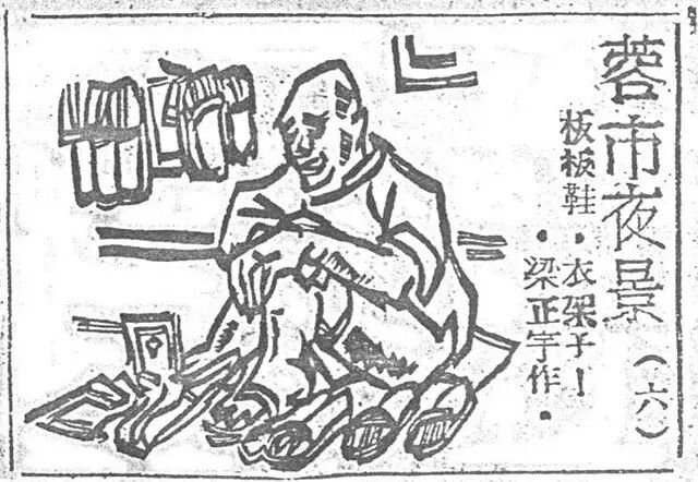 1941年《华西晚报》刊登的一幅画,一个买木拖鞋和衣架的地摊小贩