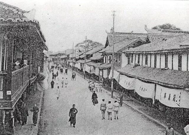 商人和小贩总是尽可能扩展他们使用的街头空间,店铺以其招牌、幌子、货摊、桌椅等把它们的“势力范围”伸展进入街道,那些招牌和幌子跨越街道两边、重重叠叠。这种场面亦成为城市景观和商业文化的一部分。他们保持着相互协作的传统,如夏天各商铺都统一行动搭凉棚以避酷暑,一首竹枝词记载了这种活动:“万商云集市廛中,金碧辉煌户户同。春暮日长天渐热,凑钱齐搭过街棚。”一张1920年代的老照片显示了这样一个街景。