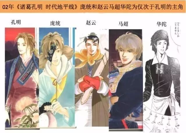 2002年 ,漫画《诸葛孔明 时代地平线》(庞统和赵云、马超为仅次于孔明的主角)由于是少女漫画,人物几乎都是美男子。连庞统、华佗都是,不管多少岁,至死都是美男子。
