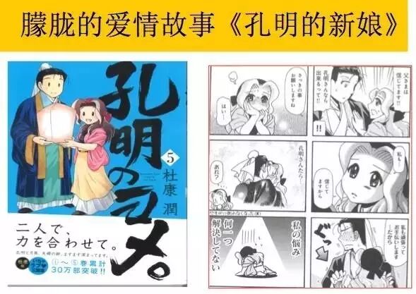 《孔明的新娘》,主人公是青年孔明和其妻黄月英。这是一个朦胧的爱情故事,二人就像高中小情侣一样,婚后一年才终于接吻。作者为这部漫画在中国留学一年,对三国颇有研究。这个漫画在一部分人当中很受欢迎,总共5册竟意外地卖了30万部。