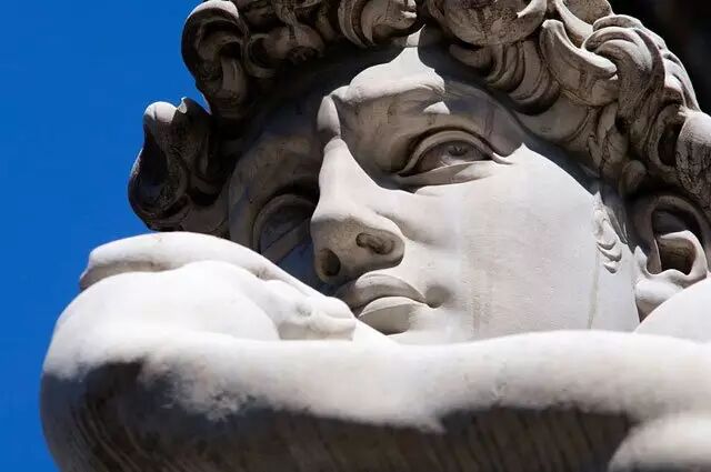 这件石像的最初来历,是阿戈斯蒂诺·迪·杜奇奥雕坏的一块坯料,被荒废了40余年。后来大师受到当地的羊毛业商会委托,妙手回春,敲凿出一件旷世巨作。按照原初设想,它应该安装到百花圣母大教堂高处,俯视全城,只是它的重量超出了建筑结构的承受力。雕像后来的落脚处,选在市政厅正门的右侧。它在这个位置上,向市民,特别是向前来参议政事的各派代表们发出一个信息——佛罗伦萨就像战胜巨人少年大卫,具有对抗强大外敌的意志,起码是在面子上。