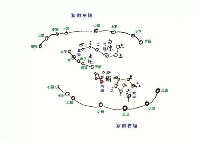 中国古代为认识星辰和观测天象,把若干颗恒星组合起来,一组称作一个星官。众星官之上,再划分中宫和二十八宿。中宫是北极附近的星空,又分为三垣(紫微垣、太微垣、天市垣),其中紫微垣居于北天中央位置,是天帝居住的地方,类似地上皇帝居住的紫禁城。除了天帝之外,皇后、太子、宫女也都在此居住。