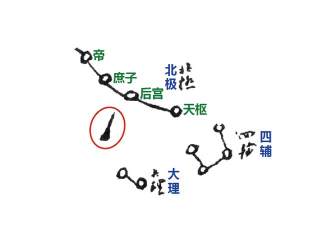从星图上可见,紫微星垣由紫微左垣和紫微右垣的十五颗星拱卫着,星垣里面,包括北极、勾陈、四辅、六甲、大理等星官。以北极五星最为尊贵。北极一星为太子、二星为天皇大帝、三星为庶子、四星为后宫、五星为天枢。勾陈为后宫,即大帝正妃,又主天子六军。四辅,是环抱北极的四星,是天帝之四邻。六甲,可分阴阳而配节候,故在天帝旁布政教、授农时。大理,在宫门内,主刑狱。这些名字,都是人间皇室和官府在天上的投射,按照古代星相学的观点,彗星出现在这样的核心区域,或预示将有重大动乱变故出现。