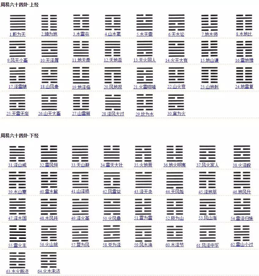 从前面附图可见,乾坤等等八卦的名称,和他们迭成三排的方式。更进一步,如果上面八卦中,两个卦迭在一起,就有六层的长线或者短线,总数就有六十四的卦象,这就是更大的分类群体。