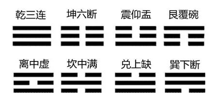 《易经》的占卜,是以四十九根筮草,分成三次,拨分为二,然后最后得到的一部分,或者是单数,或者是双数。(今天的卜卦,有些人不再用筮草,改用掷茭,或金钱,以其正、反面,代表单、双数。)单、双数配合排列,构成《易经》的图像:亦即以单数,作为一个长横,以双数作为两条不连续的短横。以一长、两短横的重迭,可以有四种重迭的方法,一上、一下,如果以三层堆栈,就有八种可能性,这就是八个卦的名称。
