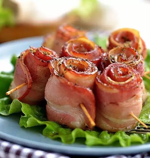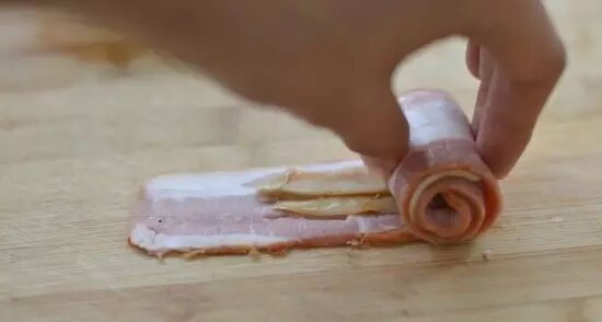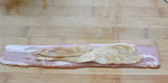 5.培根平铺,放上腌好的杏鲍菇片,不要铺太满,不然容易漏出来