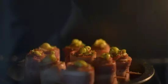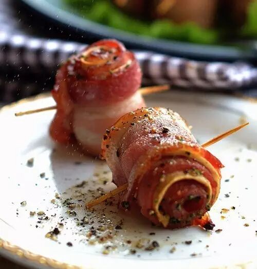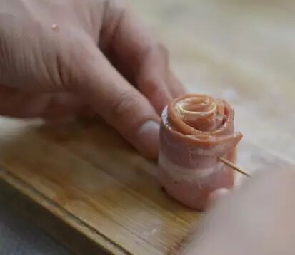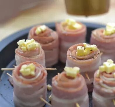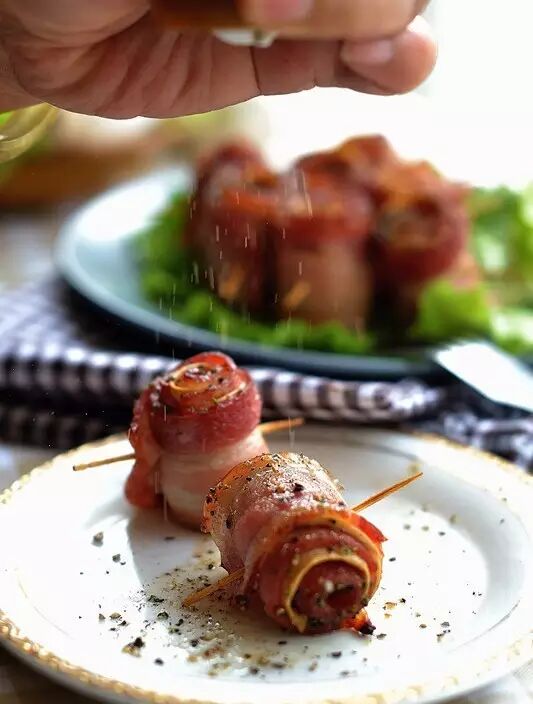 9.将10克黄油切碎后放到培根卷上,在撒少许黑胡椒碎