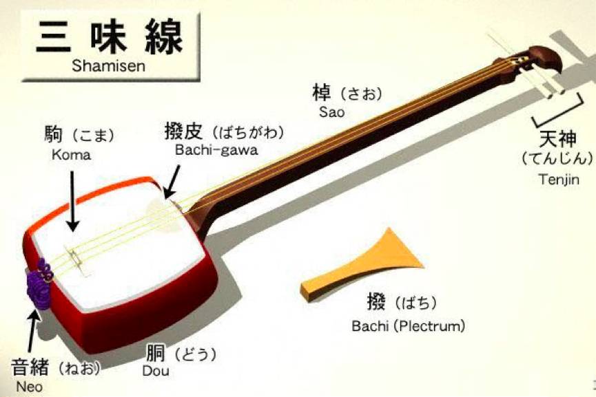 三味线虽然只有三根弦,体型上却是一个“大家伙”,琴身全长约一米,可以拆卸为三大件:“天神”(琴首)、“棹”(琴杆)、“胴”(音箱)。