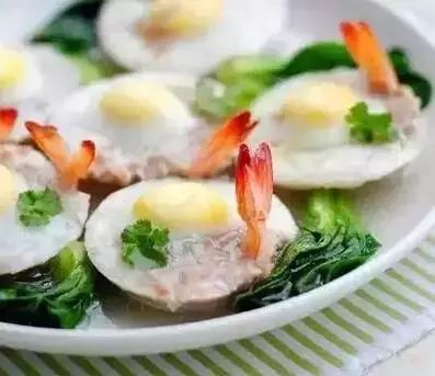 主料:虾6条、猪肉末150g、上海青6棵、鹌鹑蛋6个、火腿末1大匙、香菜末少许辅料:姜末、葱末、胡椒粉1小勺、料酒1小匙、盐1小匙、水淀粉、高汤、香油1匙、生抽1匙、蚝油1匙做法:1、虾去除虾线,剥去头、虾壳(留虾尾部分),再从背部将虾剖开,加葱姜、料酒、胡椒粉、盐腌渍20分钟入味。2、猪肉馅里加入葱姜末、料酒、胡椒粉、盐、生抽、蚝油拌匀后搅拌至肉馅上劲呈黏稠状。3、将虾分别贴放于挞模内(我用的蛋挞模,或根据现有工具选择)。4、铺上猪肉馅,中间用手指按一个小凹印。5、打上鹌鹑蛋,蛋黄位于凹印内,再撒上火腿末。6、放入蒸笼内。7、大火上汽后转中火蒸约12分钟左右至熟,然后用勺子沿碗壁挖出后摆放盘中,用香菜叶装饰一下。8、高汤加水淀粉勾薄芡,淋少许香油。9、开水中加少许盐、油,将上海青烫熟摆盘,最后浇上薄芡汤汁即可。