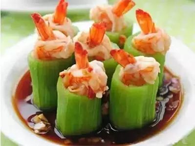 3、将做好的虾球塞在挖好的丝瓜盅里。