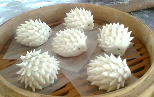 北方的主食就是各种面食了,馒头、花卷、糖包、豆包、肉龙,年夜饭的主食要蒸上好多屉,巧手的女人会捏制出各种形制的面食,点上红点,还喜欢把豆包做成刺猬状,镶上俩豆子做眼,脊上用剪刀剪出刺猬的刺状,寓意是为了“招财进宝”(“包”的谐音),巧手做面食反映了旧时北方妇女的艺术天分。
