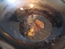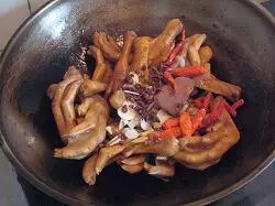 鸭爪上色后,将八角、桂皮、花椒、辣椒、姜、蒜加入锅中。