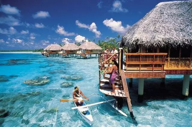 群岛优美宁静的泻湖将太平洋的深蓝变成近乎于透明的蓝,如果海上没风时,尽可以一个人划行独木舟到一个貌似天际的无人海域,这时你突然听不到任何喧嚣,一切静止下来,既没有从前,也没有过去,这一刻是禅意的,有片刻的永恒感。