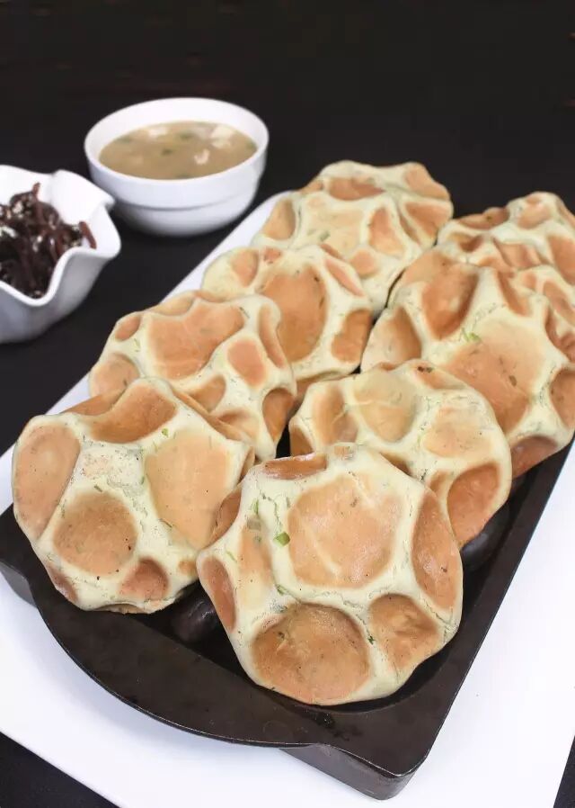 4、在饼坯表面均匀覆盖烤热的石子。取石子馍10个放入热石子垫底的铁板中,带榨菜、米粥走菜即可。