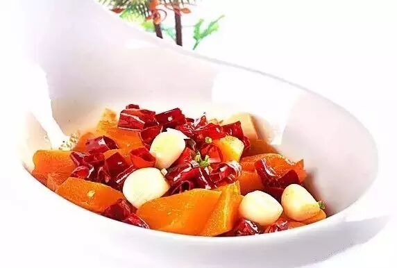 2.锅里留少许油,先下干辣椒节炒出香辣味,放入南瓜并掺水300毫升后,加盐、白糖和少许酱油调味。见锅里的汁水快干时,出锅装盘并撒上葱花,即成。