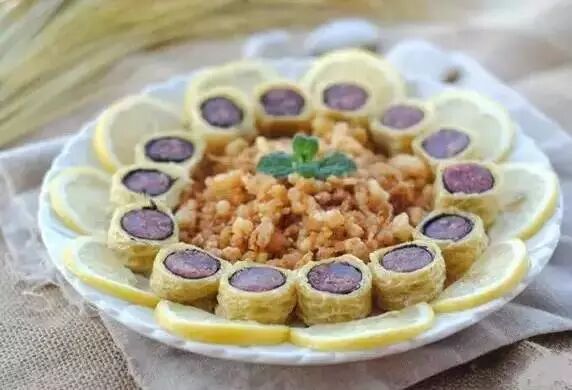 3、将鸡蛋花加适量生抽、鲜汤、麻油炒匀,摆在中间,香肠豆腐皮卷切盘即可。