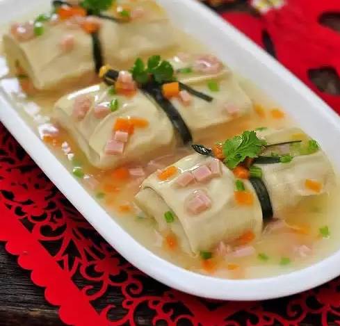 1、将豆腐皮裁去硬边,取一片海苔平铺在豆腐皮上,将香肠铺在海苔上,卷起来,用湿淀粉沾边后裹紧,入蒸柜大火蒸10分钟,取出。