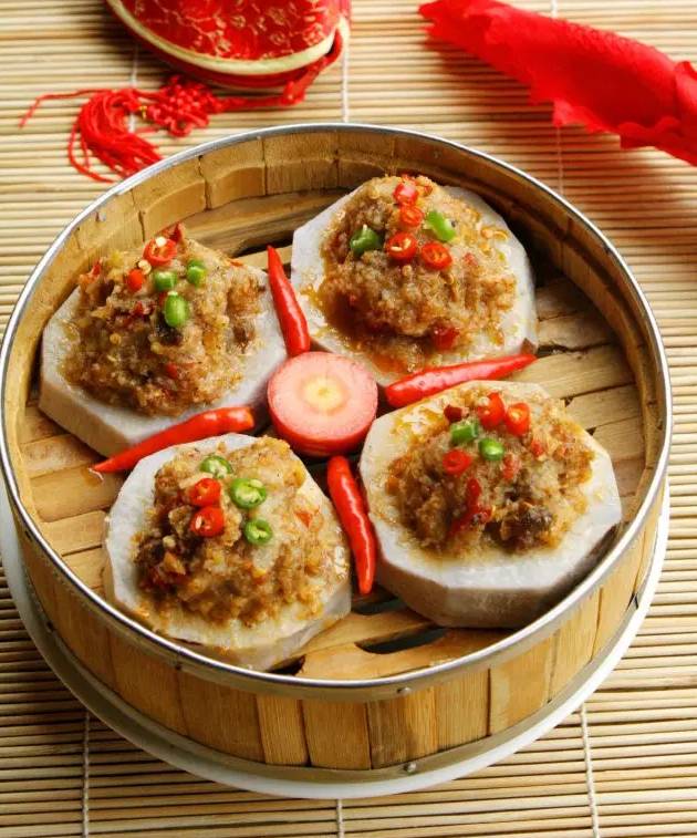 2、将香芋切成大块放在蒸笼里,放上腌制好的肉碎,入蒸柜大火蒸30分钟,取出撒上小米辣,浇上热油即可。