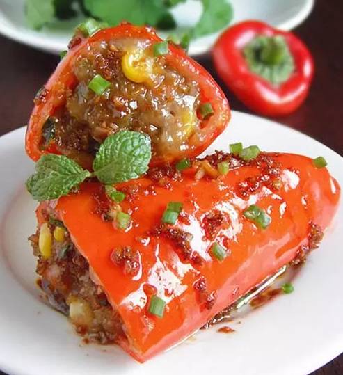 牛腿肉200克,红甜椒6个,糯米饭250克,胡萝卜、玉米、葱、姜、蒜茸各少许。