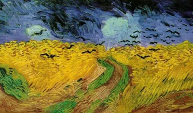 对比早些时所画景色几乎相同的《麦田里的云雀》(一八八七),那时天空与田野还是和谐的,其间盘旋着的一只云雀像个异类,但也不太格格不入,只是显得有点失落而已。再以《群鸦乱飞的麦田》比较此前不久画的《欧韦附近的平原》(一八九○),《暴风雨天的麦田》(一八九○),感觉画家的心境越来越压抑,画中的色彩对比越来越强烈,到最后那幅像是有什么忽然爆发了。