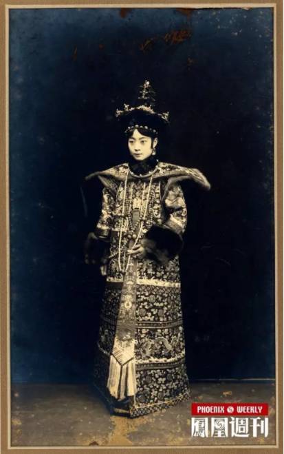 末代皇后婉容大婚朝服像。婉容(1906-1946),郭布罗氏,满洲正白旗人,其父荣源时任内务府大臣,是位开明人士。婉容幼年时期接受良好教育,通晓琴棋书画,她曾就读天津美国教会学校,对西方文化抱有浓厚的兴趣,喜好西式餐饮与爵士音乐。民国十年(1921),婉容正式获选为皇后,次年完成大婚仪式,婚后入住慈禧生前曾居住的储秀宫。末代帝后婉容受皇帝溥仪喜爱照相的影响,也留下许多照片。当时帝制虽已结束,民国政府仍给予清室优待,“大清皇帝辞位之后,尊号仍存不废,中华民国以各外国君主之礼相待。”溥仪的婚礼也还是照搬清帝大婚的礼仪,正式的婚礼长达五天。照片里婉容体态窈窕,温柔秀丽,透着身为皇后的独特气质。早年的婉容,生活多彩多姿,她与溥仪的合照也显露出不少愉快时光,但到了后期,帝后关系日渐生疏,生活的空虚使婉容开始沉溺鸦片,终致无法自拔。