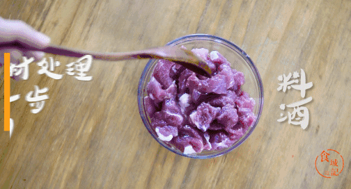 面团再发酵的同时我们就可以来处理食材了,猪肉切条再用料酒和雨露、玉米淀粉、黑胡椒搅拌腌制。