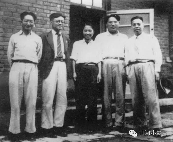 △1949年7月,沈从文、巴金、张兆和、靳以、李健吾在中老胡同32号门前