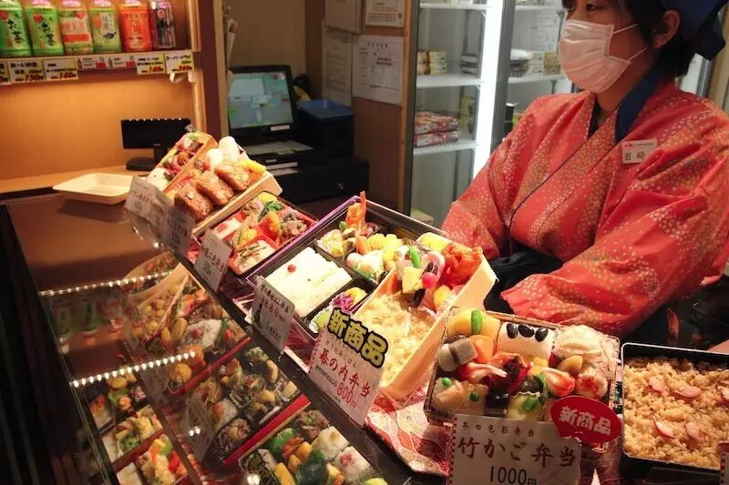 最精美的便当在车站里进闸后才能买到,在京都站里一个小亭子,琳琅满目摆着几十种便当,根据价格的不同分量也不一样。