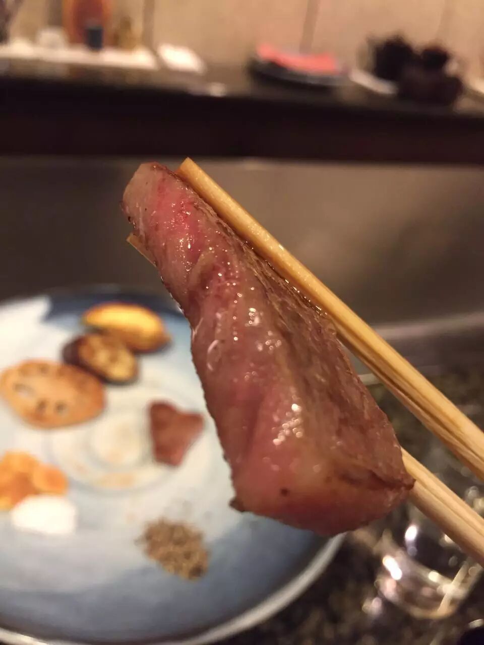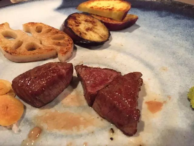 厨师会把牛肉非常均匀地切开成小条,在铮亮的铁板上不时翻动,牛肉原本的红色很快消失变成泛着油光的褐红色就上盘了。五成熟,是品尝神户牛肉的最佳口感