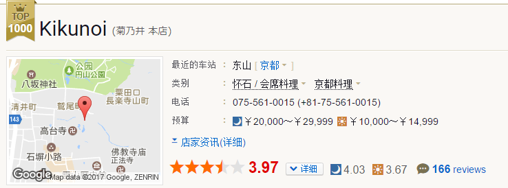 tabelog上菊乃井的评分及价格