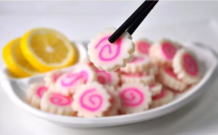 我们中国人最常见到它的地方,就是日本拉面里那个粉红色螺纹的小圆片了——将鱼做成薄片,中间染上粉红色卷起来,四周用花刀削过,再切成片状就大功告成!