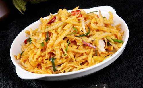 洋芋擦擦是陕北、山西晋西,甘肃陇东等地的传统饭食之一,洋芋其实就是土豆,擦擦是一种工具,用来擦土豆丝的。以土豆为主料,加少许白面加工制成,深得陕北人喜爱。色泽金黄的土豆泛着淡淡的油光,土豆的清香洋溢开来,吃上一口,既有薯条的口感和嚼头,又有肉末红椒的鲜香。洋芋擦擦属天然绿色食品,一年四季均可食用。