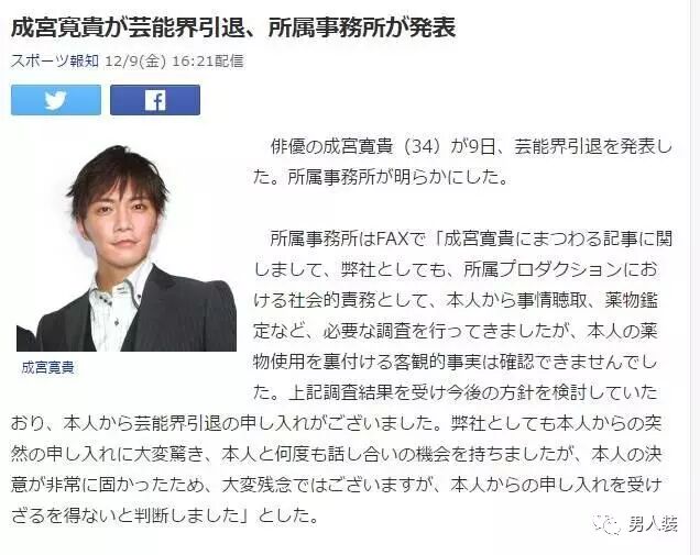 鄙公司艺人成宫宽贵吸d的传闻造成了一定社会影响,我们向其本人询问了事情经过并接受了警方的调查,证明成宫宽贵并没有吸d。但他本人决定退出演艺圈。鄙公司收到这个突然申请也很震惊,但他去意已决,实在非常遗憾。