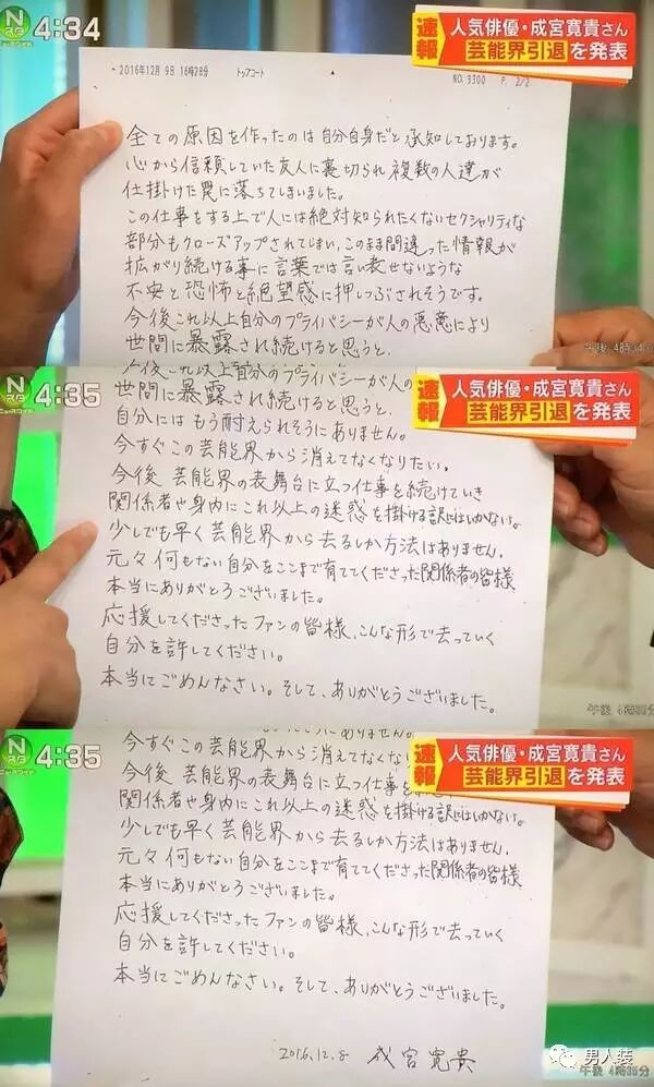 去年12月,日本演员成宫宽贵被周刊《Friday》刊登出疑似吸毒照片。成宫宽贵从16岁开始独自抚养弟弟,为了多给弟弟赚生活费才进入演艺圈,一直是以正面、有担当的形象出现在大家面前。吸d新闻被爆出,成宫宽贵的事业全面崩溃。