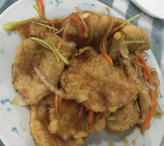 锅包肉的口感:外焦里嫩,入口微酸,逐渐有甜味显现。用盐和蒜做的,后劲有点微辣,而辽宁的做法则是用番茄酱,稍微偏甜腻。
