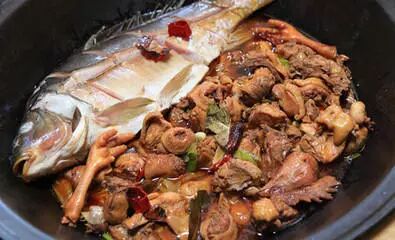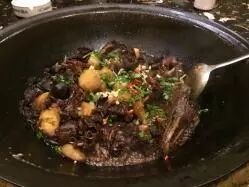最后不得不提的就是主菜,可以自主选择,排骨,鱼,鸡,也可以搭配着来。这里我只吃过排骨和肌肉,所以想谈谈他们的味道。排骨看着十分顺溜,可能因为之前的完美加工,所以吃起来肉特别的烂,但是排骨虽然好吃,却不是我心中排名第一的美食,这里的鸡肉才是最好吃的美味。这里的炖鸡很有意思,店家会把已经加工过的鸡和汤一起倒进你面前的大锅里,开始的时候是汤在上,鸡在下,如果鸡在上的时候,就说明我们可以吃了。鸡肉很嫩,鸡翅很入味,色泽好看,吃到嘴里,细致到能感觉到它的纹理。