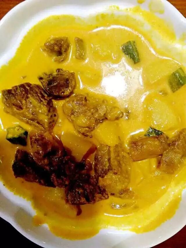 如果没记错的话,这道在咖喱界落下浓墨重彩的一笔的牛肉应该是叫仲尼牛肉,如果各位有兴趣到这家餐厅,可以打听一下。楼主并不想赞美牛肉有多么多么好吃,也不想赞美土豆有多么多么香甜,楼主想要赞美的是菜种借味做点缀的秋葵和楼主自认为十分正宗的咖喱。这道菜是店家咖喱菜中的一道,楼主很少吃秋葵,所以在这道菜中见到了秋葵,简直是一种惊喜,有人问,秋葵是什么味道,我觉得,吃起来的韧度和筋道与海白菜差不多,如果说海白菜给人一种大海的拥抱感,那么秋葵给人的就是一种大地亲切的芬芳。最最重点的咖喱,让楼主忽视了牛肉与土豆的可口,一直在不停的喝咖喱汁,咖喱汁并不十分粘稠,浓稠度和西餐厅里的奶油蘑菇汤差不多,但是味道十分新鲜,入口是奶油感,深深的咽下,喉中残留淡淡的辛辣。